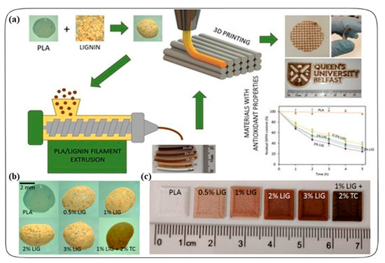 - Domínguez-Robles, J.; Martin, N.K.; Fong, M.L.; Stewart, S.A.; Irwin, N.J.; Rial-Hermida, M.I.; Donnelly, R.F.; Larrañeta, E. Antioxidant PLA Composites Containing Lignin for 3D Printing Applications: A Potential Material for Healthcare Applications. Pharmaceutics 2019, 11, 165. [Google Scholar] [CrossRef]