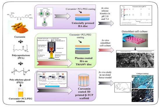 Schematic illustration of the curcumin-polycaprolactone (PCL)-poly(ethylene glycol) (PEG) polymeric system and curcumin-coated 3D printed tricalcium phosphate (TCP) scaffold for in vitro and in vivo bone generation. Reprinted with permission from Ref. [38]. Copyright (2018) Elsevier.