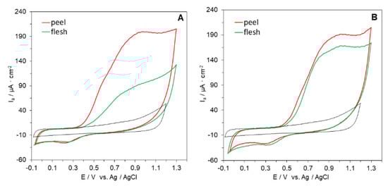 Cyclic voltammograms of peel and flesh extracts of selected apple cultivars: (A) Jonagored, (B) Antonówka. CV of electrolyte solution shown as dotted gray line. Operative conditions: extract concentration 25 mg/mL; pH 6.0; scan rate 0.1 V/s.