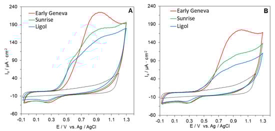 Cyclic voltammograms of selected apple cultivars: (A) extracts from peel; (B) extracts from flesh. CV of electrolyte solution shown as dotted gray line. Operative conditions: extract concentration 25 mg/mL; pH 6.0; scan rate 0.1 V/s.