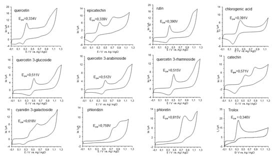 In this study, cyclic voltammograms of the phenolic compounds identified in apple flesh and peel were recorded in the range of –100 to +1300 mV at a scanning rate of 100 mV s−1. Cyclic voltammograms of 0.25 mM solutions of examined compounds in 0.1 M Britton–Robinson (B–R) buffer (pH 6.0) in 80% methanol are shown in Figure 3.