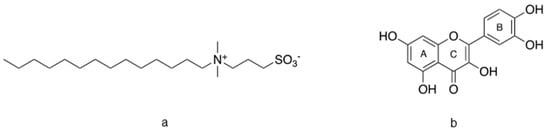 Molecular structure of (a) 3-(N,N-dimethyltetradecylammonio)propane-1-sulfonate (SB3-14), and (b) quercetin.
