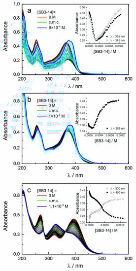 As far as SB3-14 is concerned, its non-amphoteric nature preserves its chemical alteration regardless of the experimental pH. The interaction between the different prototropic species of quercetin and SB3-14 was studied by spectrophotometric titrations performed by adding increasing amounts of surfactant to an aqueous solution of the dye, as displayed in Figure 2. In double-distilled water, the absorption spectrum of the neutral form of quercetin is characterized by a band with maximum at 366 nm (band I) and a band centered at 253 nm (band II) with a weak shoulder at about 270 nm (Figure 2a). Gradual additions of the surfactant, at concentrations below its critical micellization concentration (c.m.c.), induce a sharp decrease of absorbance together with a slight bathochromic shift of both bands I and II. The presence of aromatic rings in the quercetin structure and the absence of neat charges make the molecule poorly soluble in water; therefore, an addition of surfactant monomers determines a “salting out” effect that decreases the solubility of quercetin and consequently its absorbance. With further addition of SB3-14 above the c.m.c., an increase of absorbance of both bands I and II is detected, and the formation of a new shoulder at 388 nm is observed, clearly indicating an interaction between quercetin and surfactant aggregates. The double absorption trend just described, and well evidenced in the insert of Figure 2a, is typical of lipophilic solutes interacting with surfactant molecules entering the hydrophobic micellar core [22,32]. A high binding constant (K) value of 800 M−1 is obtained, implying a great affinity of the neutral form of quercetin with SB3-14 micelles. The retrieved value is of the same order of magnitude of that found for an association of quercetin, in solutions with similar concentration, with anionic sodium dodecyl sulfate (SDS) and sodium bis(2-ethylhexyl)sulfosuccinate (AOT) surfactant micelles [33,34].