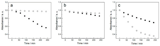 Comparison of time variation of the absorbance at specific wavelengths, referred to its t = 0 value, of quercetin (5 × 10−5 M) aqueous solutions in the absence (filled squares) and presence (open circles) of SB3-14 surfactant micelles (2.5 × 10−3 M) in double-distilled water at pH 5.5 at 373 nm (a), pH 7.0 at 370 nm (b), and pH 9.0 at 395 nm (c).