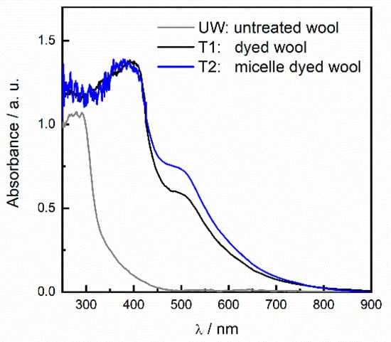 Absorption spectra of untreated wool (UW, gray) and dyed wool in aqueous onion skin extract in the absence (black) and presence (blue) of SB3-14 micelles.