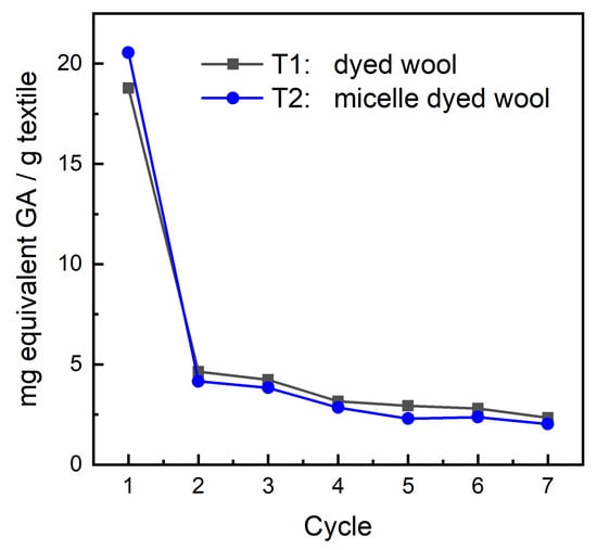 In order to virtually evaluate the release of the phenolic pool from the wool matrix, samples of textiles dyed in the presence of the zwitterionic surfactant were treated with artificial sweat (see Section 2.4 and Section 2.5 for details). An aliquot of the resulting solution was submitted to the Folin–Ciocalteu assay as described in Section 2.6. About 3 mg (on average) of treated textiles were submitted to 7 cycles of the Folin–Ciocalteu assay. The results expressed as mg equivalents GA/g textile are shown in Figure 5. The results of this study clearly indicate that the phenolic pool is rapidly delivered from the fiber, with a higher release from the sample treated with the surface-active agent. A plateau is reached soon after the first “dry-and-soak” cycle with a minor but constant release of phenols from both types of sample. A visual inspection of the fiber repeatedly submitted to the analysis did not reveal any substantial change in color intensity; thus, our original idea that only a minor amount of superficially adsorbed polyphenols is responsible for the previously observed biofunctional properties is confirmed.