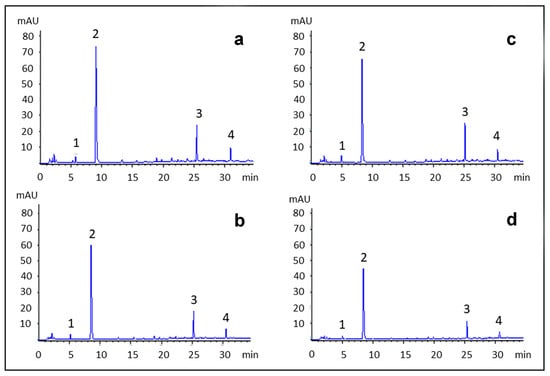 HPLC-UV chromatograms of onion extracts (a,c) and the residues after the dyeing process (b,d) in the absence (a,b) and in the presence (c,d) of the surfactant, acquired at 254 nm. Peak identification: 1. protocatechuic acid-glucoside, 2. protocatechuic acid, 3. quercetin-3-O-glucoside, 4. quercetin.