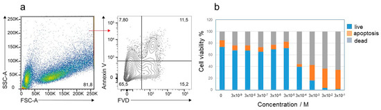 Figure 7b also shows that the cytotoxic effect at concentrations of SB3-14 higher than 3 × 10−4 M is accompanied by an increase in the proapoptotic effect. Conversely, the overall percentage of viable and apoptotic cells in samples treated with concentration of SB3-14 lower than 3 × 10−5 M is comparable to that of untreated cells.
