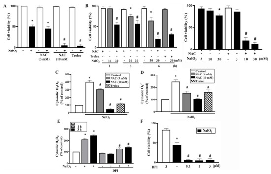 NaIO3-induced cell death is enhanced by antioxidants N-acetyl cysteine (NAC) and trolox. (A) Cells were pretreated with NAC (3 mM, 10 mM) 20 min prior to NaIO3 (30 mM) for 18 h. (B) Cells were pretreated with NAC (10 mM), trolox (500 μM) 20 min prior to NaIO3 stimulation for indicated time points (left panel) or 6 h (right panel). Cell viability was determined by Annexin V/PI staining using flow cytometry. (C,D) After pre-treatment with antioxidants followed by NaIO3 (30 mM) for 6 h, cytosolic H2O2 (C) and cytosolic O2− (D) were measured by using DCFDA and DHE, respectively. (E) After pretreatment with DPI (3 μM) 20 min prior to NaIO3 (30 mM) for indicated time points, cytosolic H2O2 was determined. (F) Cell viability was determined after cells were pretreated with DPI followed by NaIO3 (30 mM) for 18 h. Data were mean ± SEM from three independent experiments. * p < 0.05, indicating the significant effect of NaIO3. # p < 0.05, indicating the significant enhancement effects of NAC, trolox and DPI on the response of NaIO3.