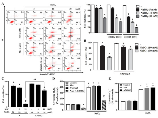 3.3. A769662 Protection While Metformin Enhancement of NaIO3-Induced Cytotoxicity Are Unrelated to Cytosolic ROS Production