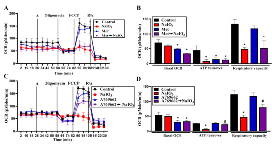 A769662, but not metformin, reverses the NaIO3-induced mitochondrial oxygen consumption rate (OCR) decrease. Metformin (6 mM) (A) or A769662 (30 μM) (C) were pretreated 26 min prior to NaIO3 injection through Port A. Then cells were subsequently treated with oligomycin, FCCP and antimycin A/rotenone. Intracellular OCR was measured by seahorse XF24 analyzer. (B,D) Resting OCR, ATP turnover and respiratory capacity were analyzed and the data were mean ± SEM from three independent experiments. * p < 0.05, indicating the significant effects of NaIO3. # p < 0.05, indicating the inhibitory effects of A769662 on the action of NaIO3.