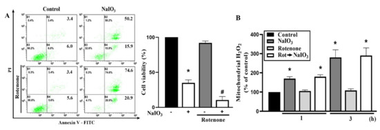 Rotenone enhances the NaIO3-induced retinal pigment epithelium (RPE) cytotoxicity. Cells were treated with rotenone (10 μM) 20 min prior to NaIO3 (30 mM) stimulation. Cell viability was measured by Annexin V/PI staining (A) and mitochondrial H2O2 was determined by mitoPY1 staining (B). Data were mean ± SEM from three independent experiments. * p < 0.05, indicating the significant effects of NaIO3. # p < 0.05, indicating the significant effect of rotenone to increase cell death under NaIO3 stimulation.