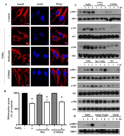 A769662 but not metformin reverses the NaIO3-induced mitochondrial fission and Drp-1 phosphorylation. After treatment with metformin (6 mM), A769662 (30 μM) and/or NaIO3 (30 mM) for 6 h, Tom20 and DAPI staining were conducted. Scale bars indicated 10 μm (A). Mitochondrial mass was determined by Mitotracker green staining followed by flow cytometry (B). Data were mean ± SEM from three independent experiments. * p <0.05, indicating the significant effect of NaIO3. (C,D) After treatment with indicated agents, cell lysates were prepared for immunoblotting. Data were representative of three independent experiments.