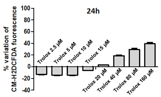 Percentage variation of fluorescence intensity in HeLa cells exposed for 24 h to increasing concentrations of Trolox (from 2.5 to 160 µM) and then charged with 5-(and-6)-chloromethyl-2′,7′-dichlorodihydrofluorescein diacetate (CM-H2DCFDA). The ordinates indicate the percentage variation of the probe fluorescence intensity, which was calculated as follows: (fluorescence of control cells − fluorescence of treated cells)/(fluorescence of control cells) × 100. Data are expressed as mean ± SEM of 3 independent experiments.