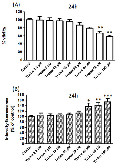 Moreover, as shown in Figure 2B, HeLa cells exposed for 24 h to Trolox at concentrations of 40, 80, and 160 µM showed a significant increase in the fluorescence of PI compared to control cells, while no significant change was observed at lower Trolox concentrations (Figure 2B). Propidium iodide cannot pass through a viable cell membrane, but it binds to DNA intercalating with the double helix in dead cells. Therefore, the results obtained with propidium iodide confirmed the viability results obtained with the MTT test.