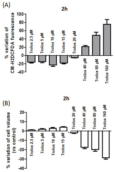 In parallel, the cell size of the cells exposed to different Trolox concentrations was measured. A decrease in cell dimension at 40, 80, and 160 µM after 2 h was evident (Figure 4B), and it was indicative of isotonic cell shrinkage, namely, AVD.