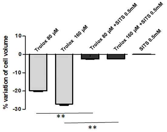 AVD is known to be due to the loss of K+ and Cl− from the cells [45]. As reported in Figure 5, when HeLa cells were preincubated with the 0.5 mM disulfonic stilbene derivative SITS (4-Acetamido-4′-isothiocyanato-stilbene-2,2′-disulfonic acid), a known inhibitor of Cl− channels [46], and then exposed to Trolox 80 and 160 µM for 2 h, the Trolox-induced isotonic shrinkage was completely prevented. On the other hand, SITS alone was not able to produce any significant alteration of cell size.