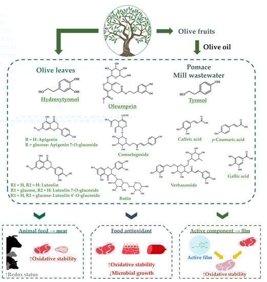 This review aims to discuss the phenolic composition, antioxidant potential and antimicrobial activity of phenolic compounds found in Olea europaea leaves, olive pomace and wastewater as well as their application in animal feeding for meat production and the use in meat products. In addition, a second objective is to find a variety of studies that feature designed food products of animal origin free of artificial preservatives and using natural extracts obtained from olive oil industry by-products.