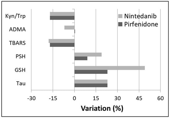 In 2014, the Food and Drug Administration approved nintedanib and pirfenidone for IPF treatment because of their ability to retard disease progression [,]. Pirfenidone is an antifibrotic drug with well-known anti-inflammatory and antioxidant properties [,]. Nintedanib is a tyrosine kinase inhibitor with anti-angiogenic effects through the blockade of the vascular endothelial growth factor (VEGF) pathway []. More recently, studies have also reported that nintedanib exerts anti-oxidant and anti-inflammatory effects [,]. However, the anti-inflammatory and anti-oxidant effects of pirfenidone and nintedanib have been primarily observed in in vitro studies [,,,,]. Therefore, we sought to determine the presence of such effects in vivo by investigating a comprehensive panel of markers of OS and inflammation in IPF patients before and after 24-week treatment with pirfenidone or nintedanib and in a group of age- and sex-matched healthy participants. In particular we assessed the plasma concentrations of: (i) Nrf2, a transcription factor that controls the expression of enzymes and proteins responsible for cellular defence against OS; (ii) TBARS, a group of aldehydic substances (principally malondialdehyde) deriving from lipid peroxidation and the most frequently used biomarker of oxidative stress; (iii) GSH, a tripeptide thiol found at high concentrations in cells where it exerts antioxidant effects, reducing ROS such as superoxide or the hydroxyl radical; iv) PSH, the total protein –SH groups that act as a key redox buffer in plasma, scavenging reactive oxygen and nitrogen species; (v) homocysteine and cysteine, low-molecular mass thiols involved in free radicals and hydrogen peroxide production due to the high reactivity of their thiol group; (vi) ADMA and arginine, amino acids commonly found in human circulation, involved in nitric oxide (NO) production. Oxidative stress may lead to a shift in the ADMA/arginine ratio, toward ADMA accumulation, resulting in diminished NO synthetase (NOS) activity and subsequently lower NO availability; (vii) tryptophan and its degradation product kynurenine, well recognized biomarkers of immune activation. Systemic inflammation is commonly associated with increased kynurenine and/or decreased tryptophan concentrations.