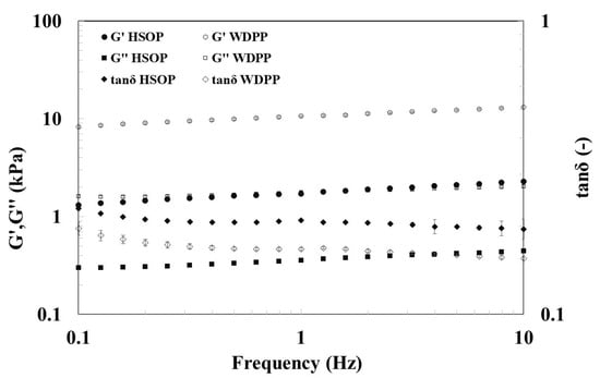 The test reported in Figure 1 shows that both the samples are typical weak gels [42]; G’ is higher than G’’ of one order of magnitude and both moduli increase with the frequency of oscillation. Moreover, sample WDPP shows both dynamic moduli higher than HSOP, being more consistent and structured.