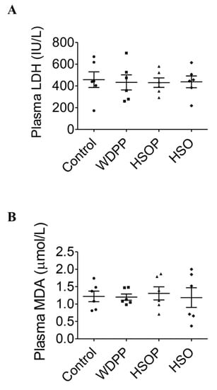Injury (LDH) and oxidative stress (MDA) markers in plasma of rats fed with SD, or WDPP, or HSOP, or HSO for 8 weeks: (A) LDH; (B) MDA. n = 6 for each group; data are expressed as means ± SEM. statistical significance: One-way ANOVA and the non-parametric Newman-Keuls Multiple Comparison Test.