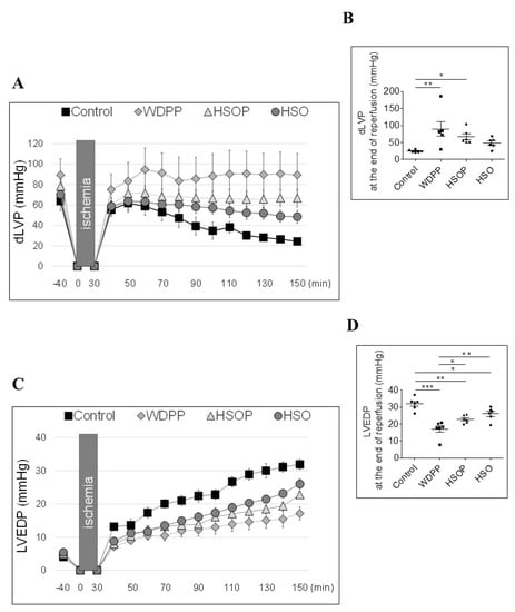 The hearts were allowed to stabilize for 40 min to record the baseline parameters. Inotropism was evaluated in terms of developed left ventricular pressure (dLVP; mmHg, index of contractile activity); cardiac contracture was evaluated in terms of left ventricular end-diastolic pressure (LVEDP), whose baseline value was established at the beginning of perfusion as 5–8 mmHg [37,38].