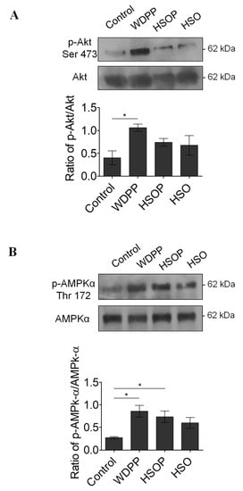 The analysis of Akt (index of the activation of cardioprotective pathways) and AMPK (used as an energy stress sensor and modulator index) phosphorylation levels in I/R hearts revealed that p-Akt increases only in the WDPP group (Figure 8A), and p-AMPK increases in both WDPP and HSOP with respect to the other experimental groups (Figure 8B).