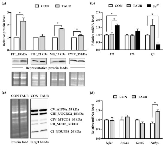 Taurine enhanced ferritin and myoglobin protein levels. (a) The mean protein levels of ferritin light chain (FTL), cytochrome c (CYTC) and myoglobin (MB) were increased after taurine (TAUR) supplementation. The levels in the untreated control (CON) were set to 1 for each individual experiment, and the results of TAUR supplementation are given relative to those of CON. Target band intensity was densitometrically analyzed and normalized by total protein load per lane, as visualized in a stain-free UV image. Representative pictures of the target bands (FTL, FTH, CYTC and MB) and the corresponding total protein bands are shown. (b) The mRNA levels of iron-sensitive genes Ftl, Fth and Tfr were quantified in response to treatment with TAUR and iron (II) sulfate (Fe2+). Fe2+, which was used as a positive control, significantly enhanced Ftl and decreased Tfr mRNA levels compared to those of untreated cells. The mRNA levels of Fth were not affected by Fe2+ or taurine. (c) A representative picture of target bands indicating the subunits of mitochondrial oxidative phosphorylation (OXPHOS) complexes CI (NADH dehydrogenese), CII (succinate dehydrogenase), CIII (ubiquinol-cytochrome c reductase), CIV (cytochrome c oxidase) and CV (ATP-Synthase) for CON and TAUR and the corresponding total protein load are shown. (d) The relative mRNA levels of NFU1 iron-sulfur cluster scaffold (Nfu1), BolA FAMILY MEMBER 3 (Bola3) and glutaredoxin 5 (Glxr5) were not affected, while nucleotide binding protein like (Nubpl) mRNA was upregulated in response to taurine supplementation. The data are shown as the means + SD (n = 3) for the protein analysis and means + SEM (n = 6) for mRNA results. * Indicates a significant difference; p < 0.05.