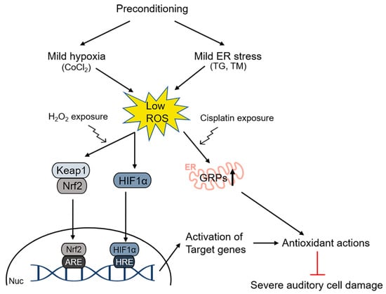 In addition, hypoxic preconditioning conferred significant protection against broadband noise exposure via the activation of hypoxia-inducible factor 1 subunit alpha (HIF-1α) within the organ of Corti [123]. Under normoxic conditions, HIF-1α is hydroxylated and degraded [135]. However, under hypoxic conditions, HIF-1α is not hydroxylated and accumulates in the tissue. As cobalt ions can induce tissue hypoxia, HIF-1α expression could be induced by cobalt chloride (CoCl2). In CoCl2-treated mice, noise exposure, which was supposed to induce a permanent threshold shift of hearing, could not induce permanent hearing loss [122]. In contrast, YC-1, a HIF-1α inhibitor, attenuated this protective role of CoCl2. A subsequent study revealed that CoCl2 pretreatment protected auditory hair cells (HEI-OC1) from H2O2-mediated cytotoxicity via the activation of the redox-sensitive transcription factors HIF-1α and NRF2, as well as their target gene PRDX6, indicating the protective roles of antioxidant enzymes against noise-triggered oxidative damage [136]. The involvement of oxidative stress in hearing impairment has also been reported in the case of cisplatin-mediated ototoxicity, where mild endoplasmic reticulum (ER)-related stress-induced upregulated expression of glucose-related protein (GRP) 78 and 94, resulting in the attenuation of intracellular ROS accumulation and cisplatin-triggered caspase-associated apoptotic signaling in HEI-OC1 cells [137], as shown in Figure 2.