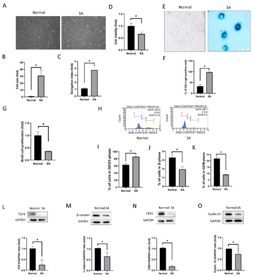 The cell proliferation rate, as determined by BrdU incorporation assay, was lower in the SA group than in the normal group (p < 0.001; Figure 1G). Results of cell cycle analysis were different for the normal group and SA group (Figure 1H). Cells from the SA group were arrested in the G0/G1 phase. The proportion of cells in the G0/G1 phase was higher in the SA group than in the normal group (p < 0.001, using independent t-test; Figure 1I). The proportion of cells in the S-phase and in the G2/M phase was significantly lower in the SA group than in the normal group (p < 0.001 for all data points, using independent t-test; Figure 1J,K).