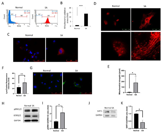 Mitochondrial oxidative stress, elongation, and lysosome staining. (A) MitoSOX staining intensity of cells as analyzed using the Muse cell analyzer. (B) Mitochondrial oxidative stress levels were compared between the normal and SA groups. (C) Fluorescence imaging using the MitoSOX probe shows mitochondrial oxidative stress in cells. (D) MitoTracker red was used for mitochondrial imaging of cells from normal and SA groups. Mitochondrial elongation is shown in the SA group. (E) Mitochondrial elongation is greater in the SA group as compared to that in the normal group. (F,G) Lysosomal staining of cells from the normal and SA groups. (H,I) phospho- extracellular signal-regulated protein kinases 1 and 2 (pERK1/2) expression levels are shown. (J,K) SIRT1 expression levels are shown. All experiments were performed in triplicate or quadruplicate. * for p < 0.05 using independent t-test.