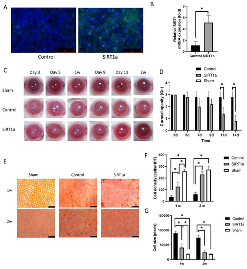 Immunofluorescence staining of SIRT1 showed SIRT1a overexpression in SIRT1a group (Figure 3A). qRT-PCR showed that relative SIRT1 mRNA level was elevated to 246.7 ± 12.5% of the control group (p = 0.008, Figure 3B). Corneal opacity was different among groups (p < 0.001, ANOVA). Corneal opacity in the SIRT1a group was decreased compared to the control group on days 11 and 14 (p < 0.001 for both; Figure 3C,D). Alizarin red S staining showed that the density of CECs at the center and the cell size was different among groups (p < 0.001 for all, ANOVA). The densities of CECs at the center were higher in the SIRT1a group than in the control group and the cell size was smaller in the SIRT1a group compared to the control group (p < 0.001 for all; Figure 3E–G). The densities and sizes of CECs in SIRT1a group were lower and larger compared to Sham at 1 week (p < 0.001 for both). Then, there was no difference in the densities and sizes of CECs between SIRT1a group and Sham at 2 weeks.