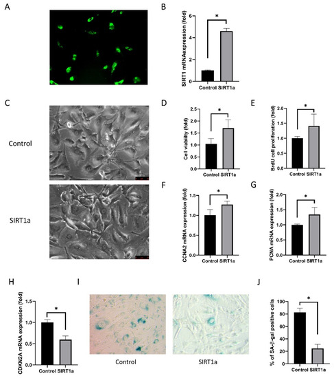 GFP-encoded plasmids were transfected into the cells (Figure 4A). The transfection efficiency was 92.1 ± 2.0%. Relative SIRT1 mRNA expression in cultured hCECs of the SIRT1a group was elevated to 247% of the control (p < 0.001; Figure 4B). Cell shape was polygonal in the SIRT1a group compared to the control (Figure 4C). Cell viability and proliferation rate was higher in the SIRT1a group compared to the control (p = 0.004 and 0.048; Figure 4D,E). Relative mRNA expression levels of CCNA2 and PCNA were increased in the SIRT1a group compared to the control (p = 0.008 and 0.028; Figure 4F,G). CDKN2A mRNA expression was lower in the SIRT1a group compared to the control (p < 0.001; Figure 4H). The proportion of SA-β-gal stained cells was lower in the SIRT1a group than in the control group (p < 0.001; Figure 4I,J).