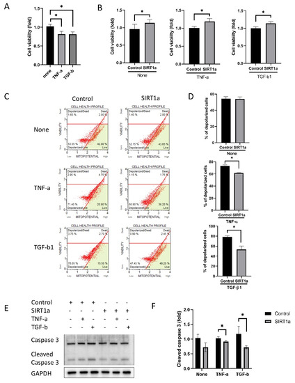 Cell viability was reduced in cells treated with TNF-α or TGF-β1 (p = 0.004 for both; Figure 5A). Cell viability was increased in the SIRT1a group compared to the control both when untreated or when treated with either TNF-α or TGF-β1 (p = 0.028, < 0.001 and < 0.001; Figure 5B). Mitochondrial membrane potential was depolarized upon TNF-α or TGF-β1 treatment (Figure 5C). The proportion of depolarized cells was elevated in the SIRT1a group compared to the control upon treatment with TNF-α or TGF-β1 (p < 0.001 for both; Figure 5C,D). The level cleaved caspase 3 was decreased in SIRT1a group compared to control upon treatment with TNF-α or TGF-β1 (p = 0.028 and 0.038; Figure 5E,F).