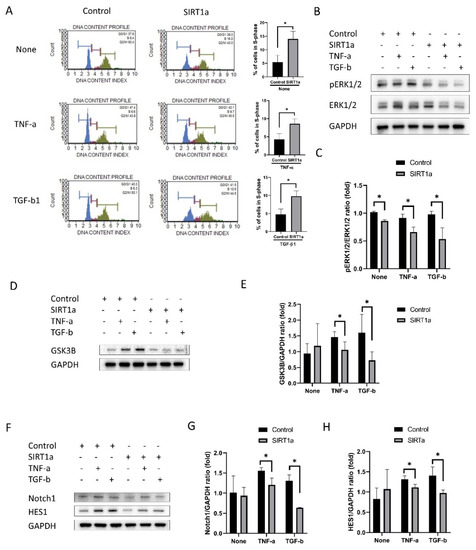 Cell cycle analysis by DNA content measurement revealed that the proportion of cells in S-phase was elevated in SIRT1a group compared to the control in untreated or upon treatment with either TNF-α or TGF-β1 (p = 0.040, 0.012 and 0.007; Figure 6A). pERK1/2, GSK3β, Notch1 and HES1 levels were reduced in the SIRT1a group compared to the control upon treatment with TNF-α or TGF-β1 (p = 0.018 and 0.021 for pERK1/2, p = 0.039 and 0.035 for GSK3β, p = 0.029 and 0.009 for Notch1, and p = 0.036 and 0.032 for HES1; Figure 6B–H).