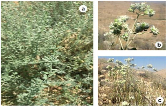 Vegetative growth (a), budding (b), and full bloom (c) of T. polium collected from Hail region.