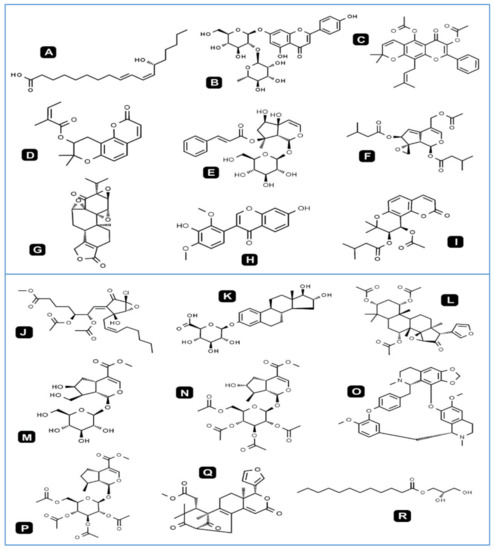 Chemical structures of the most dominant identified compounds in T. polium methanolic extract by using High Resolution-Liquid Chromatography Mass Spectrometry (HR-LCMS). (A). 13R-hydroxy-9E,11Z-octadecadienoic acid, (B). Rhoifolin, (C). Sericetin diacetate, (D). Selinidin, (E). Harpagoside, (F). Valtratum, (G). Triptonide, (H). Koparin 2′-Methyl Ether, (I). Dihydrosamidin (J). 10S,11R-Epoxy-punaglandin, (K). 4, 16alpha, 17beta-Estriol 3-(beta-D-glucuronide), (L). Khayanthone. (M). 10-Hydroxyloganin, (N). 7-Epiloganin tetraacetate, (O). Cepharanthine, (P). Deoxyloganin tetraacetate, (Q). Carapin-8 (9)-Ene, (R). 1-dodecanoyl-sn-glycerol.
