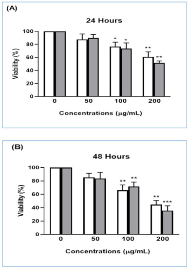 The anticancer effect of the T. polium extract was investigated by MTT assay on two malignant lineages: mammary gland carcinoma (Walker 256/B cells) and prostate cancer (MatLyLu). Both cell lines have high metastatic potential and are commonly used to induce bone metastases [48,49]. The cells were treated with the plant extract at different concentrations 0, 50, 100, and 200 µg/mL for 24 or 48 h.
