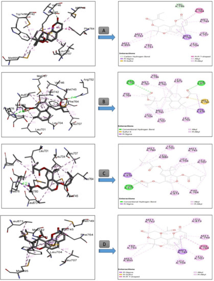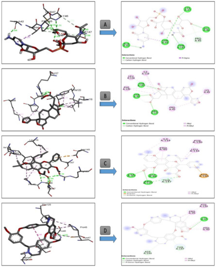 Three-dimensional (right) and 2D (left) closest interactions between the active site residues of the human androgen and some molecules belonging to different class compounds with the best score result. Legend: (A): Compound 15 (Selinidin, Class: coumarin derivative), (B): Compound 18 (larixol acetate), (C): Compound 19 (Valtratum, Class: Terpene) and (D): Compound 22 (dihydrosamidin, Class: coumarins).
