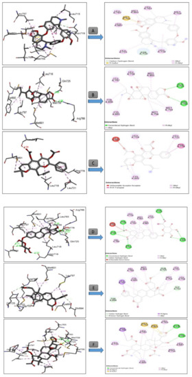 Three-dimensional (right) and two-dimensional (left) closest interactions between active site residues of the human progesterone receptor and some molecules belonging to different class compounds with the best score result. Legend: (A): Compound 8 (Cepharantine, Class: Alkaloid), (B): Compound 20 (Triptonide, Class: Diterpene triepoxide), (C): Compound 10 (Sericetin diacetate, Class: Flavonol), (D): Compound 24 (16alpha,17beta-Estriol 3-(beta-D-glucuronide, Class: Steroidal glycosides), (E): Compound 14 (Carapin-8 (9)-Ene, Class: Limnoid), (F): Compound 28 (Khayanthone, Class: Limnoid).