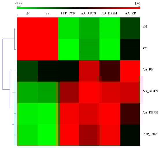 Table 3 shows the results of peptide content and antioxidant activity of peptides obtained from raw meat and fermented lamb loin. The results revealed that fermented meat products had several times higher content of peptide compared to raw meat. The peptide content isolated from raw meat ranged from 2.90 to 4.31 mg g−1 of sample while in fermented meat products it was in the range of 11.59 to 16.37 mg g−1 of product). These results are not surprising as peptides are the results of muscle protein degradation because of proteolytic activity of endogenous enzymes together with lactic acid bacteria. In fermented meat products, the protein degradation is influenced by different variables including product formulation and processing conditions, which also influence the obtained acidity of the products []. Kato et al. [] point out that the presence of lactic acid bacteria induces a decrease of pH resulting in a greater activity of endogenous muscle proteases. This observation has been confirmed in this study. The correlation between the examined parameters, presented in the heat map (Figure 1), shows that the correlation between pH of fermented loins and the peptide content is negative. Thus, it was found that the peptide content increased with the decrease in the pH of the products. The statistical analysis also indicated that treatment was the factor with significant effect on peptide content, no effect of animal breed was found. In case of fermented loins produced from meat of Wrzosówka lamb breed, the highest content of peptides was found in the sample macerated with fermented milk (P3). It can be assumed that the use of fermented milk reduced the pH during fermentation of meat products and thus a higher activity of endogenous muscle proteases. Fermented milk itself is also a source of bioactive peptides [,]. As reported by El-Salam and El-Shibiny [], peptides isolated from cow milk proteins show mineral-binding, opioid, ACE inhibitory, immunomodulatory, cytotoxicity, anti-carcinogenic, antibacterial, and anti-thrombotic activities. Whey proteins (lactalbumin, lactoperoxidase, lactoglobulin, immunoglobulins and lactoferrin) play a special role in the generation of bioactive peptides in fermented milk []. In addition, it was indicated that the sample of fermented lamb loin without the addition of sodium nitrate (P2) showed a higher content of bioactive peptides (14.41–15.80 mg g−1 of product) compared to the sample with nitrate (P1) (14.08–15.56 mg g−1 of product). The inverse relationship was found for Uhruska lamb meat products, the lowest peptide content was observed for the sample macerated with fermented milk. In the case of lamb meat products of the Świniarka breed, no statistically significant differences in the peptide content were found between the samples.