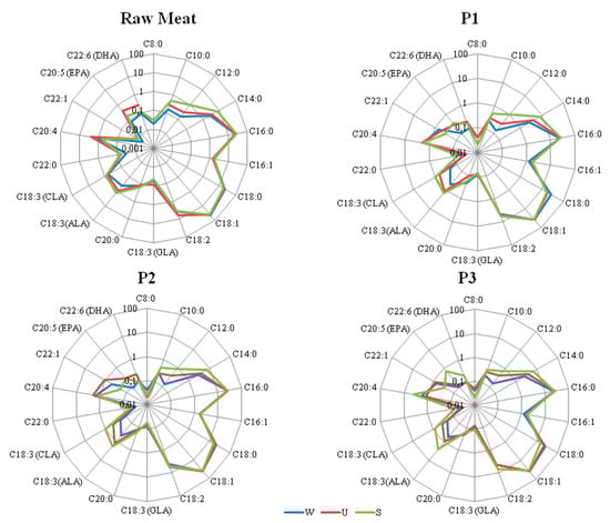 Fatty acids profile [%] of different treatment of lamb products. P1–P3 types of treatment: P1—treatment with sea salt and sodium nitrate, P2—treatment with sea salt, P3—treatment with sea salt and fermented milk. W, U, S—lamb breeds: W—Wrzosówka, U—Uhruska, S—Świniarka.