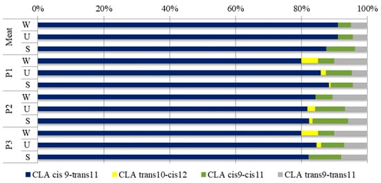 The contribution of individual CLA isomers to the total quantity of conjugated linoleic acid. W, U, S—lamb breeds: W—Wrzosówka, U—Uhruska, S—Świniarka; P1–P3 types of treatment: P1—treatment with sea salt and sodium nitrate, P2—treatment with sea salt, and P3—treatment with sea salt and fermented milk.