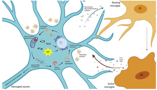 Neurodegenerative diseases are characterized by progressive and chronic cell dysfunction and death that frequently starts affecting specific regions of the central nervous system (CNS), worsening over time and impacting more regions in a predictable fashion. Neuronal loss is often associated with protein misfolding and aggregation both in the extracellular space and intracellularly, in specific cells (Figure 1). While many neurons cope with sustained ROS increases, there are particular cell populations that show varying degrees of susceptibility to OS, a phenomenon that has been called differential vulnerability [22].