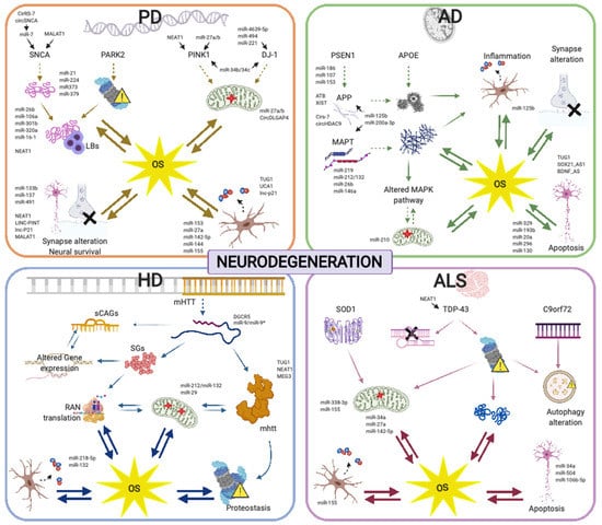 Specific ncRNA pathways regulating the cell response to OS are similarly altered in diverse neurodegenerative conditions, which may underlie commonly perturbed pathways, including mitochondrial dysfunction and the spread of insoluble protein inclusions. However, the altered activity of ncRNAs specifically targeting disease-related genes provides a scenario highlighting the differences in the development and progression of the different neurodegenerative diseases (Figure 2, Table S1).