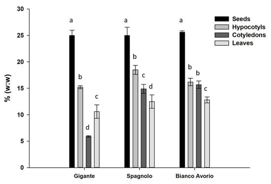 Regarding the oil content, the results showed that the highest oil concentration is reached in the seeds, with an average level of 25.2%, in agreement with previous reports [52] but without substantial differences between the three analyzed genotypes (Figure 1). The lowest average level was found in the leaves for all genotypes, with the exception of “Gigante”, for which the lowest average oil content was detected in cotyledons.