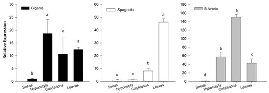 Transcriptional analysis of the CcHQT gene by qRT-PCR in seeds, hypocotyls, cotyledons and leaves of “Gigante”, “Spagnolo” and “Bianco Avorio” cultivated cardoon genotypes. Results are expressed as fold changes relatively to seeds, used as internal calibrator of gene expression for each genotype. Each value represents the mean ± SD of three biological and two technical replicates. Different letters denote a significant difference between tissues by analysis of variance [ANOVA]. Statistical significance was defined as p < 0.05, using the Tukey’s post hoc test for mean separation.