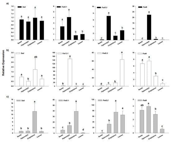 Transcriptional profiling of SAD, FAD2.1, FAD2.2 and FAD6 genes by qRT-PCR in seeds, hypocotyls, cotyledons and leaves of cardoon genotypes. (a) “Gigante”, (b) “Spagnolo”, (c) “Bianco Avorio”. Results are expressed as fold changes relatively to the tissue with the lowest expression level, used as internal calibrator for each gene within each genotype. Each value represents the mean ± SD of three biological and two technical replicates. For each gene, different letters denote a significant difference between tissues within each genotype by analysis of variance [ANOVA]. Statistical significance was defined as p < 0.05, using the Tukey’s post hoc test for mean separation.