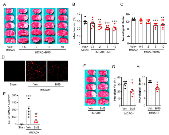 BMS administration reduces acute brain injuries in mice at one day after transient middle cerebral artery occlusion (tMCAO) challenge. Mice were challenged with tMCAO. BMS was administered to mice immediately after reperfusion (A–E) or at 3 h after reperfusion (F–H). Effects of BMS on brain damage were assessed at 24 h after tMCAO. (A–C) Effects of BMS at different dosages (0.5, 2, 5, and 10 mg/kg) on tMCAO-induced brain infarction (A,B) and neurological deficits (C). n = 7 mice per group. ** p < 0.01 and *** p < 0.001 versus vehicle-administered tMCAO mice (Veh + tMCAO). (D,E) Effects of BMS (5 mg/kg) on apoptotic cell death determined by TUNEL assay. Scale bar, 50 μm. n = 5 mice per group. *** p < 0.001 versus sham. ## p < 0.01 versus vehicle-administered tMCAO mice (Veh + tMCAO). (F–H) Effects of delayed administration (at 3 h after reperfusion) of BMS on tMCAO-induced brain infarction (F,G) and neurological deficits (H). n = 7 mice per group. * p < 0.05 versus vehicle-administered tMCAO mice (Veh + tMCAO).