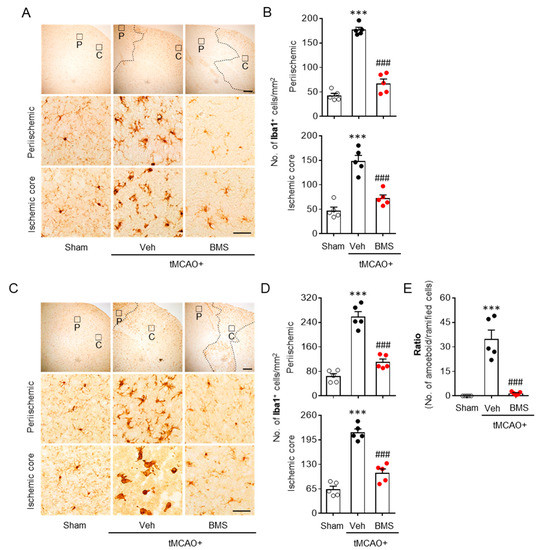 BMS administration attenuates microglial activation in mice at one day and three days after tMCAO challenge. Mice were challenged with tMCAO. BMS (5 mg/kg) was administered to mice immediately after reperfusion. Effects of BMS on tMCAO-induced microglial activation were assessed at one day (A,B) and three days (C–E) after tMCAO challenge. Representative images of Iba1-positive cells (A,C) in periischemic (P) and ischemic core (C) regions. Scale bars, 200 µm for top and 50 µm for middle and bottom. Quantification of Iba1-positive cells in periischemic and ischemic core (B,D) regions. (E) Quantification of ratio of amoeboid to ramified cells at three days after tMCAO challenge. n = 5 mice per group. *** p < 0.001 versus sham. ### p < 0.001 versus vehicle-administered tMCAO mice (Veh + tMCAO).